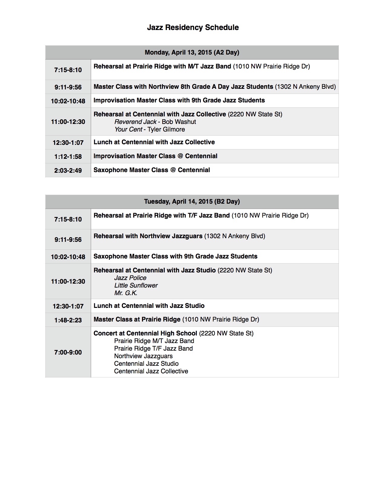 On Monday and Tuesday, April 13 and 14, we will be hosting Dr. David Camwell, professor of saxophone and jazz studies at Simpson College. Professor Camwell will be working with students in our two 7th grade jazz bands, the Northview Jazzguars, and Centennial’s Jazz Studio & Jazz Collective in rehearsals and master classes. Permission slips are due back Friday, April 10. An itinerary is provided below: